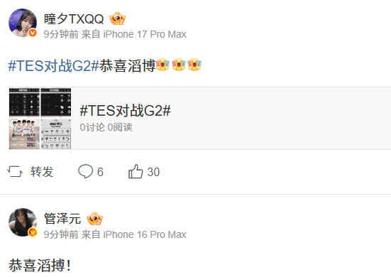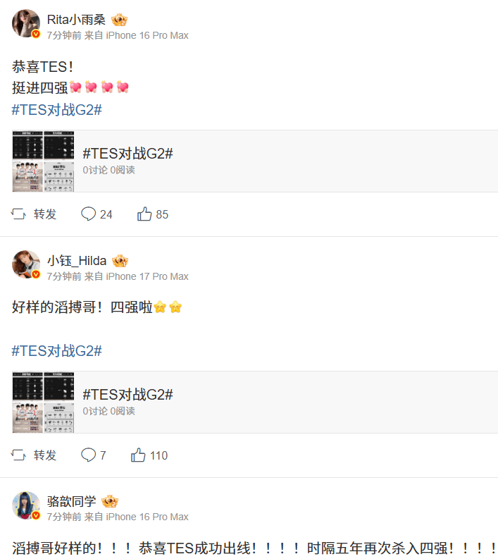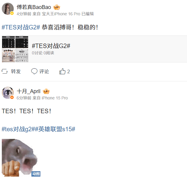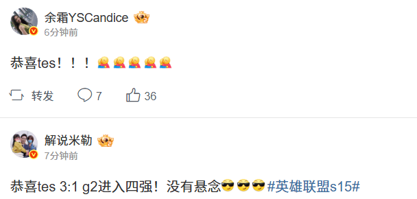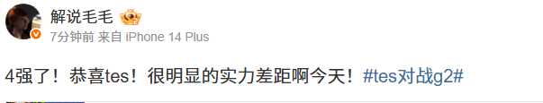 虎扑10月30日讯S15淘汰赛,TES3-1G2,晋级半决赛。LPL赛区的解说主持们发文热议。